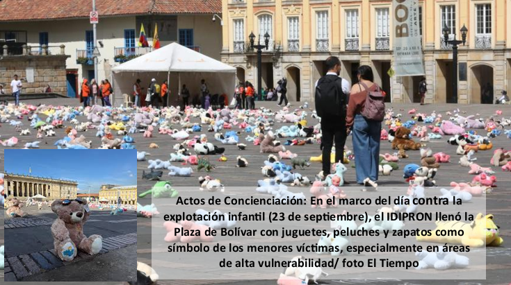 - Incidencia en la opinión pública y defensa de los derechos de la niñez: El Instituto desarrolló acciones de alto impacto dirigidas a la opinión pública, destacándose la realización del primer acto simbólico en la Plaza de Bolívar, centro de Bogotá, en homenaje a los niños, niñas y adolescentes víctimas de la Explotación Sexual Comercial (ESCNNA). Esta iniciativa se constituyó en un hito institucional para visibilizar, prevenir y mitigar este grave fenómeno, reafirmando el compromiso del Instituto con la protección integral y la garantía de los derechos de la niñez y la adolescencia.